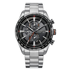 Read MoreInitially introduced in 1987, the Attesa watch series is dedicated to delivering a heightened sense of luxury, unmatched precision, and unwavering performance within Citizen's line of chronographs. This timepiece boasts a resilient, scratch-resistant Super Titanium™ case and a matching bracelet. It features a world-time-equipped bezel and showcases silver, black and orange accents that contrast beautifully against the elegant black three-register chronograph dial, which also includes a date window at 3 o'clock. In addition to its striking design, the Attesa offers a host of practical features, such as world time functionality covering 26 time zones, a power reserve display, a perpetual calendar with day and date indicators, 12/24-hour timekeeping, a sapphire crystal for added durability, and water resistance up to 100 meters. What sets this watch apart is its implementation of Eco-Drive technology and Atomic Timekeeping capabilities. This means that the watch will automatically synchronize with the correct time and date when travelling abroad, thanks to its ability to receive local time signals from transmitters and atomic clocks in three distinct regions: Europe, the USA, and Japan.