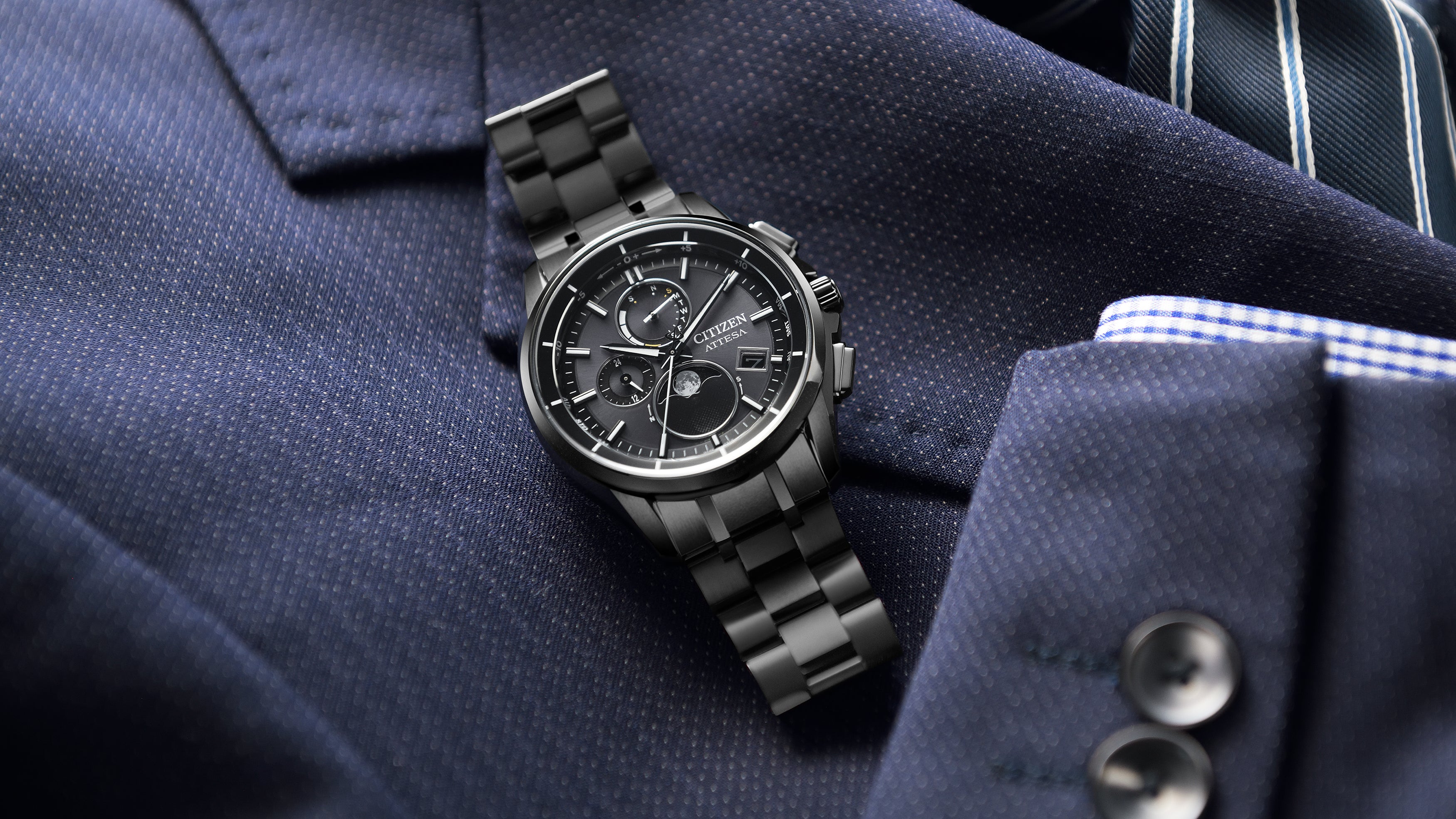 Calibre H874, Eco-Drive, Radio-Controlled, Perpetual Calendar, Anti-Magnetic, Power Save Function, Overcharge Prevention, Automatic Station Selection, Scheduled Reception, Forced Reception, 1/20sec Chronograph, Automatic Moon Phase Display, Automatic Moon Phase Calculation Function, Manual Moon Phase Manual Correction Function, World-Time Display, PERFEX®, Perfex Multi 3000, Quick Start, Daylight Savings Function, 12/24 Hour Display, Day-Date, 2.5 Year Power Reserve (In Power-Save Mode), Low Charge Indicator