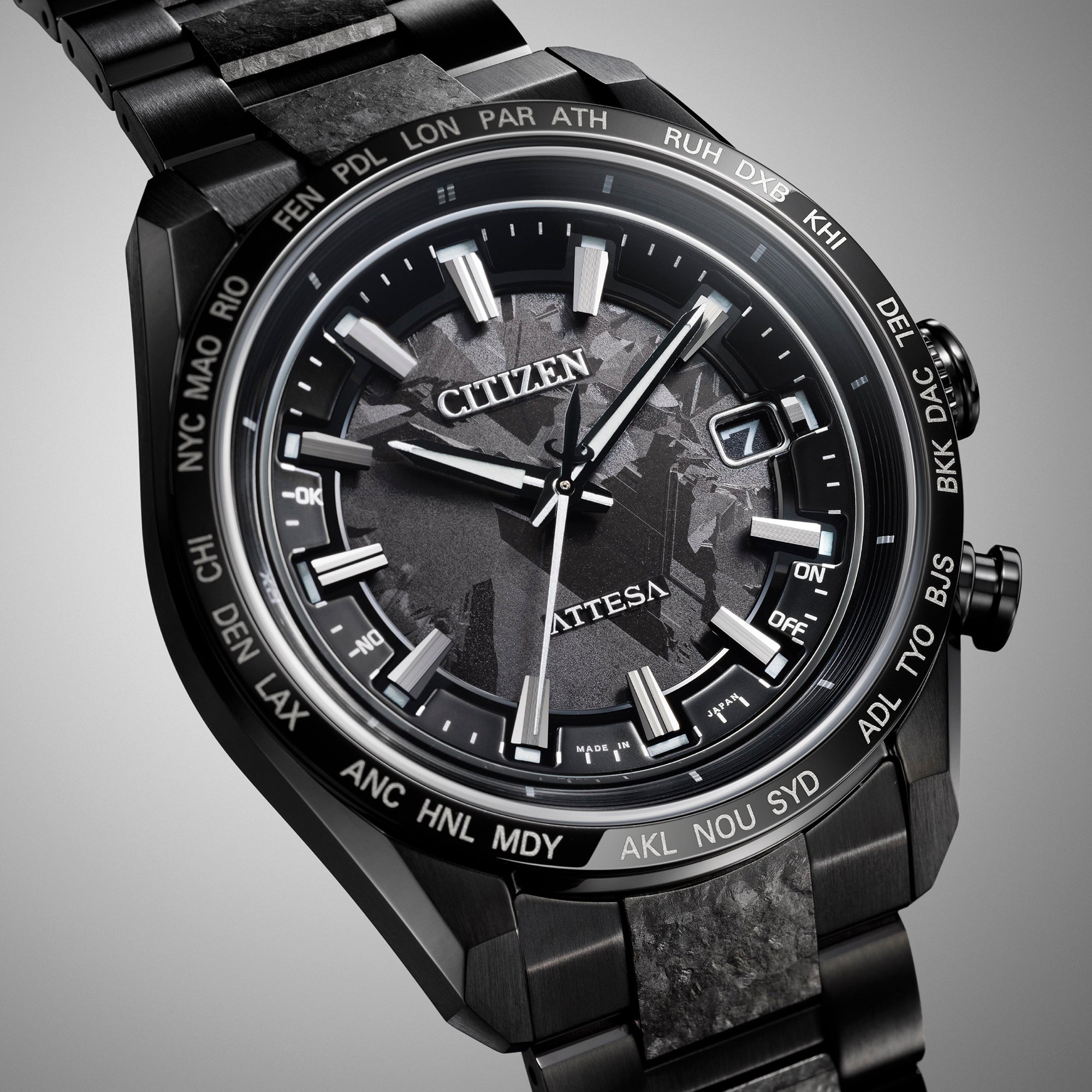 This collaborative timepiece design captures the essence of the HAKUTO-R Lander's ongoing journey, embodying the vast, pitch-black expanse of the universe and reflecting the challenges undertaken by the moon lander. The jet-black dial and matching band showcase a layered crystal pattern reminiscent of crystalline titanium, creating a striking monochromatic composition. Powered by Eco-Drive technology, equipped with Radio-Controlled precision, and housed within a durable Duratect DLC scratch-resistant Super Titanium™ case, this timepiece delivers exceptional scratch resistance alongside a remarkably smooth tactile experience. Polished silver accents on the inner ring and markers provide an elegant contrast to the deep black finish, symbolising the light that emerges beyond darkness. Key features include a 26-city world time function, a sapphire bezel with black-tone accents, a power reserve indicator, a perpetual calendar a sapphire crystal, and water resistance up to 100 meters. Limited to 1,900 pieces worldwide. (Please note that the radio-controlled functionality will not work in Australia due to the absence of radio transmitting stations within range. These stations are exclusive to four regions: Europe, USA, China and Japan. However, this does not affect manual time adjustment. Please refer to your instruction manual for guidance.)