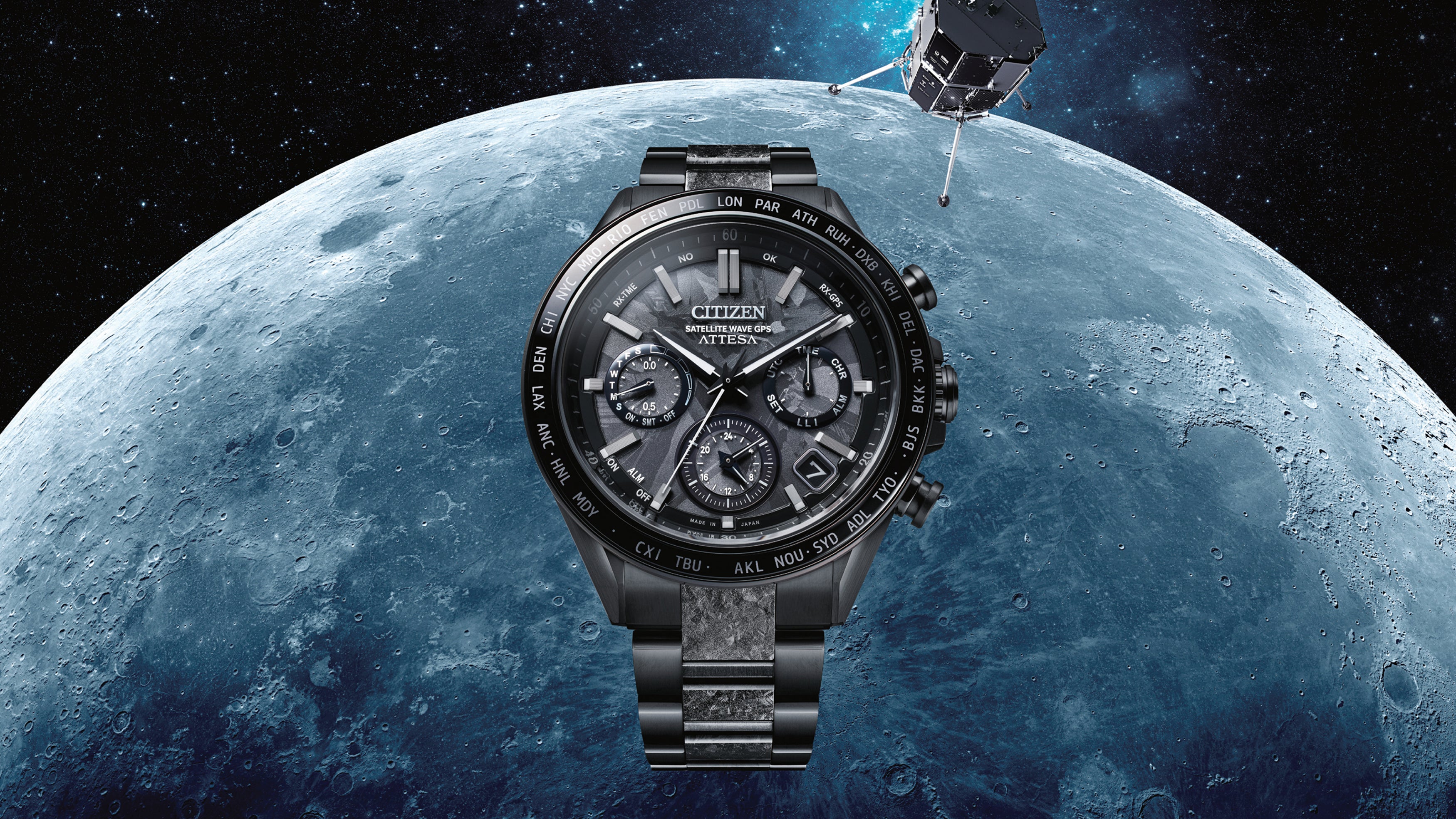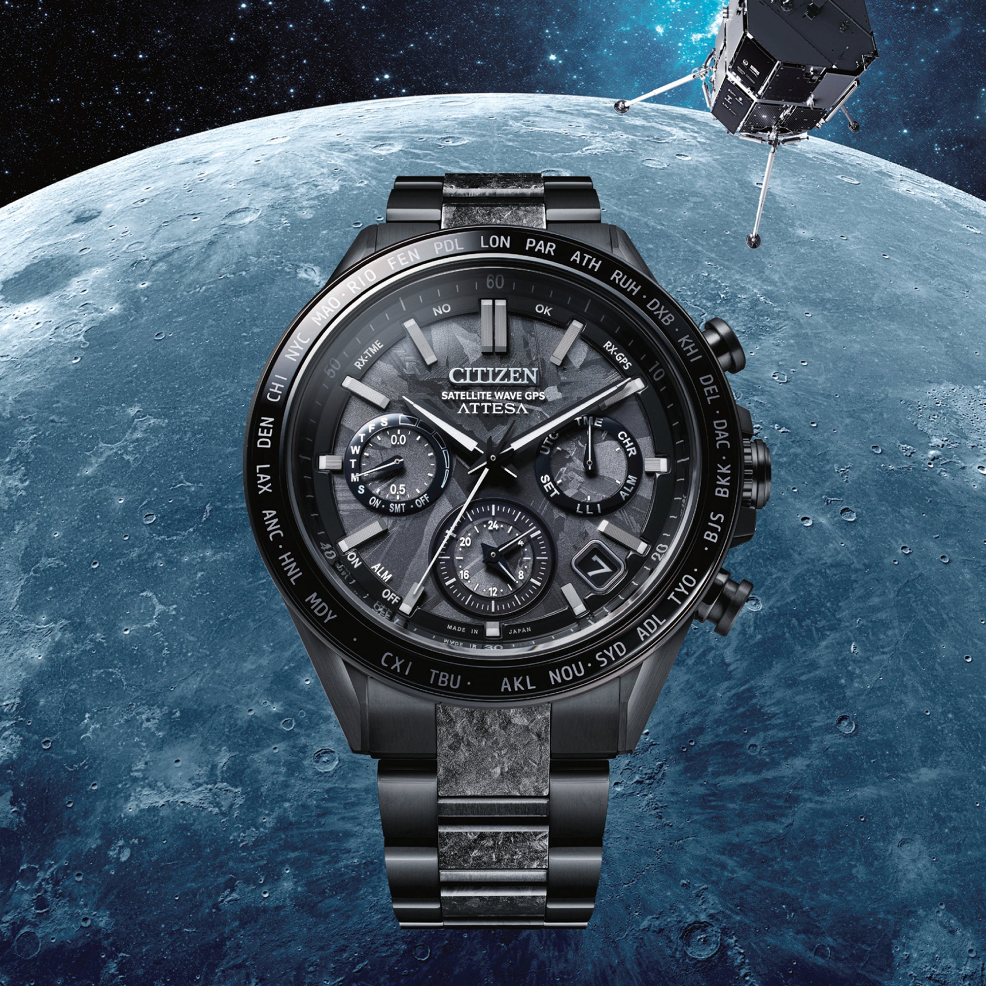 Renowned for its innovative design and advanced technology, Attesa continues to set the benchmark in the evolution of reliable luxury timepieces. As part of the distinguished Black Titanium Series, this F950 collaborative timepiece—powered by cutting-edge Eco-Drive Satellite Wave GPS technology—distinguishes itself with the world’s fastest time-only signal reception, achieved in just three seconds. Designed to capture the essence of the HAKUTO-R Lander's ongoing journey, it embodies the vast, pitch-black expanse of the universe and reflects the challenges undertaken by the moon lander. The jet-black dial and matching band feature a layered crystal pattern reminiscent of crystalline titanium, creating a striking monochromatic composition. Equipped with Eco-Drive technology, Radio-Controlled precision, and housed within a durable, scratch-resistant Duratect DLC Super Titanium™ case, this timepiece offers both exceptional resilience and a remarkably smooth tactile experience. Key features include a Duratect DLC sapphire bezel crafted using advanced vapour deposition technology, 39-city world time, black-tone accents, dual time zone functionality, a perpetual calendar, light level indicator, charge suspension temperature detection, overcharge prevention, overdischarge detection, and water resistance up to 100 metres. Limited to 2,300 pieces worldwide.
