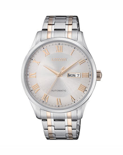 Read MoreAn enticing fusion of precision, durability and stylish design elements, this watch reflects meticulously considered craftsmanship in the pursuit of enduring quality. This gents watch is a new member of the Citizen Mechanical Collection. With an Automatic movement, silver toned dial, two tone rose gold bracelet, and rich gold hands, it is a sophisticated expression of style.