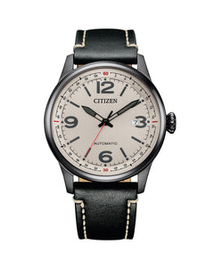 Read MoreA watch designed for sport and aviation enthusiasts alike. This men's automatic watch features a brushed black stainless-steel case, black leather strap, ivory dial with large Arabic numerals at the compass points, exhibition case back and water resistance of 100 meters.