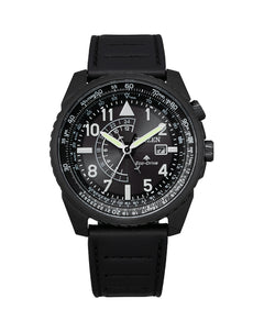 Read MoreDesigned for aviation enthusiasts, the Promaster Sky’s detailed aesthetic features a rotating slide rule and a high visible dial with 8 arabic numbers and luminous hands and markers for night visibility. Equipped with Citizen core Eco-Drive technology, allowing the watch to generate energy from both sunlight and indoor light thus ensuring constant battery. Additional features include dual time functionality, date, 12/24 hour time display and water resistance up to WR200/20 bar suitable for swimming and snorkelling activity. The classic black dial, black stainless steel case and sophisticated black calf leather band allow for both professional and everyday use. 42.5mm case. Calibre B877.