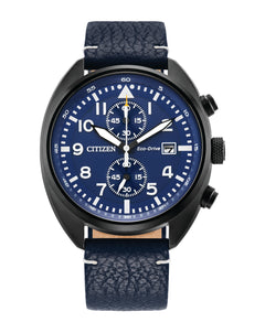 Read MoreClean lines, instantly convey a look destined to become a classic. Featuring chronograph, date and sleek blue dial. Crafted with a stylish Black Ion stainless steel case and leather strap. Powered by Eco-Drive technology, never needing a battery.