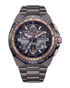 Embodying the spirit of adventure across air, land, and sea, the Promaster line marks its 35th anniversary with a striking new limited edition series. The Promaster Sky, part of this exclusive collection, boasts cutting-edge technology and a distinctive rose gold and black color scheme. This standout chronograph features a gray IP stainless steel case adorned with pink-tone accents on the bezel, crown, and chronograph pushers. The bold 46mm case is paired with an integrated black stainless steel bracelet, creating a dynamic and stylish look. Beneath a scratch-resistant sapphire crystal, the watch’s high-tech display integrates analog and digital elements, enhanced by pink-tone highlights. The Promaster Sky offers a suite of advanced functions, including atomic time clock synchronization for unmatched precision, time settings for 43 world cities, a 1/100-second chronograph with a 24-hour capacity, a perpetual calendar, GMT dual time (second time zone), two alarms, a 99-minute countdown timer, a digital backlight display, Universal Coordinated Time (UTC) display, and a power reserve indicator. Powered by Citizen's Eco-Drive technology, it harnesses light to operate, eliminating the need for batteries. This high-performance watch is presented in an exclusive Sakura pink Promaster tackle box and is water-resistant to 200 meters. With only 5,600 pieces available worldwide, this limited edition model is a rare and coveted collector’s item.