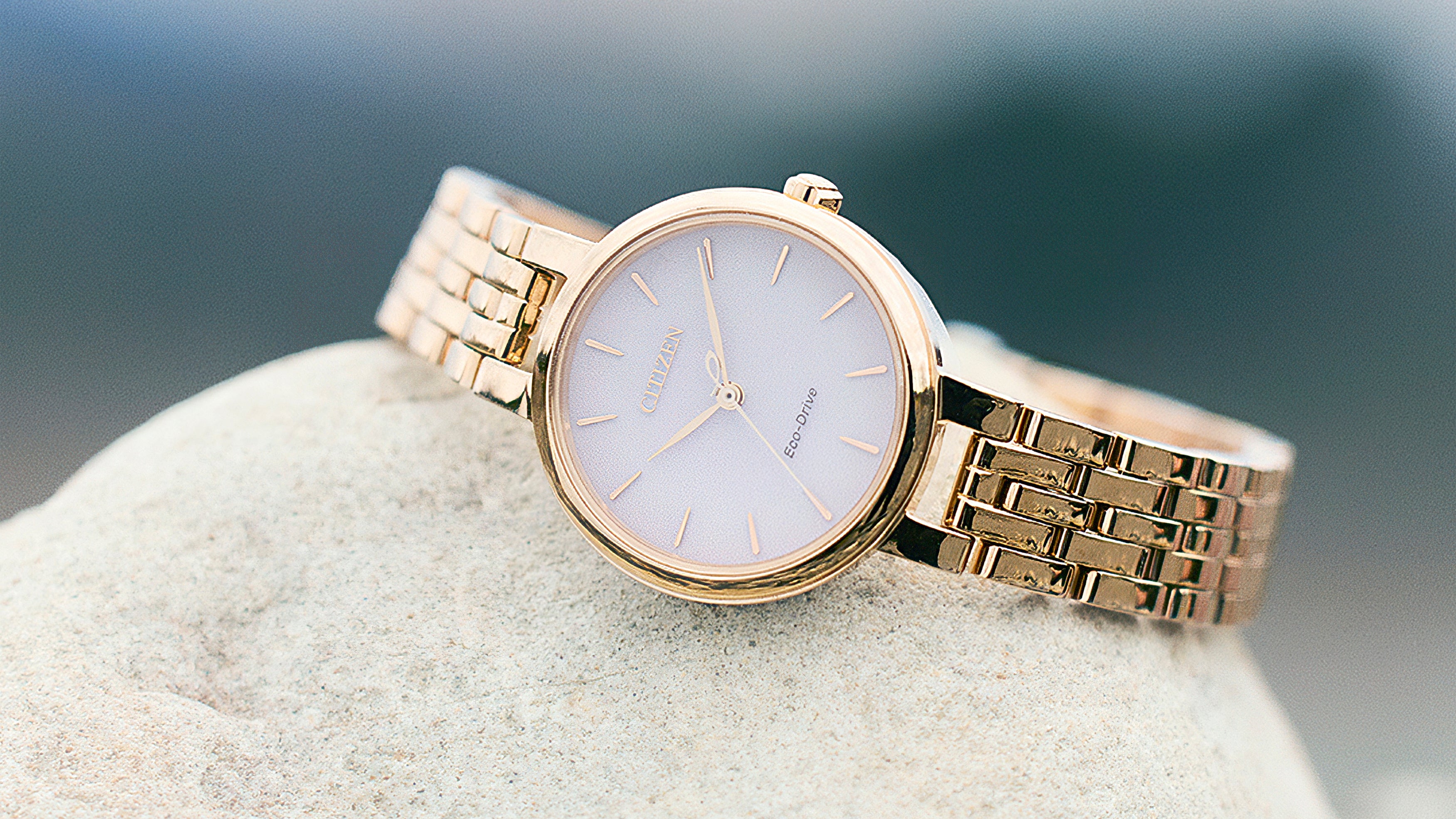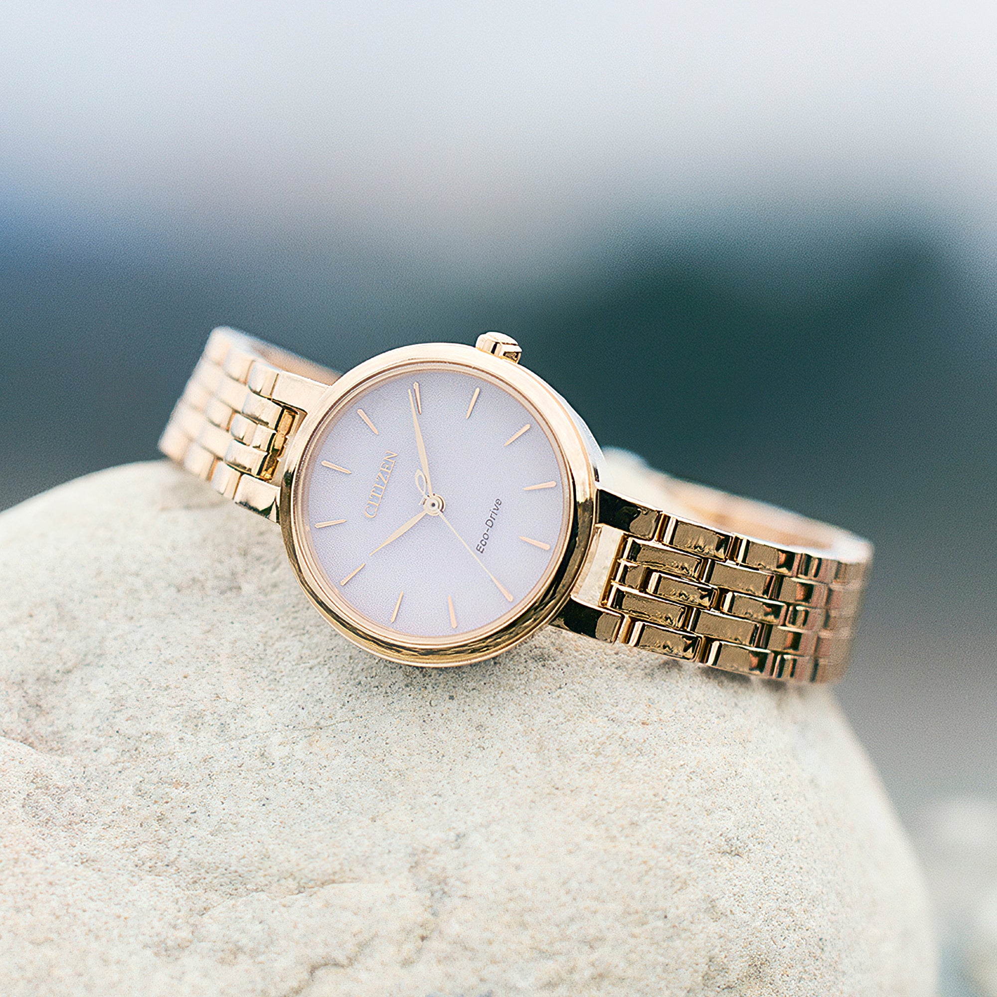Part of the Dress collection, this ladies timepiece features a rose gold-tone stainless-steel case and bracelet with double-push closure, charming pink dial and slim silver-tone hands. Additional features include sapphire glass, Eco-Drive technology and water resistance of 50 meters.