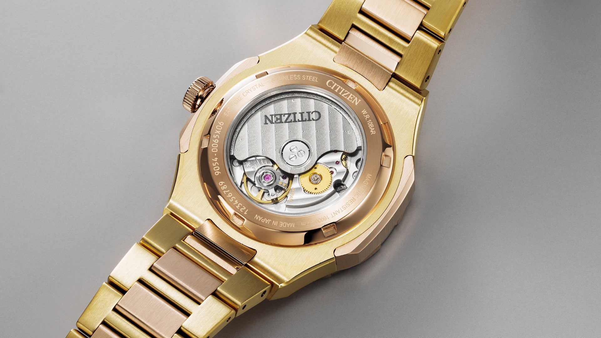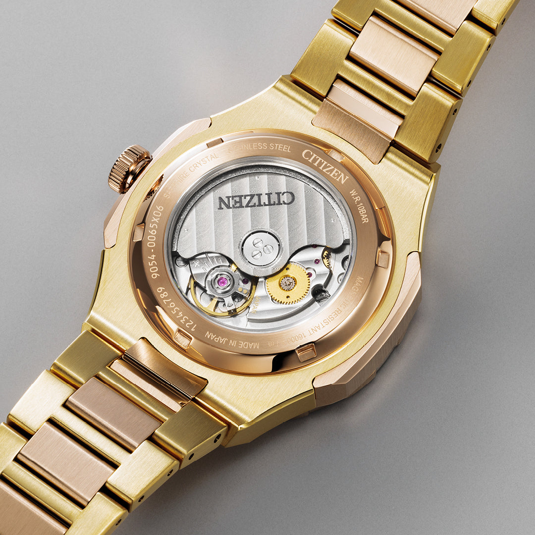 Designed for the modern explorer, the Citizen Series 8 880 GMT combines practicality, innovation, and sleek style. Its 41mm rose and gold-tone stainless steel case is paired with a striking black and green bi-directional bezel, showcasing Citizen's signature polished and brushed finishing. Powered by the advanced Caliber 9054 movement, this watch features dual time zone functionality with an independently adjustable hour hand, ideal for travelers. The automatic GMT mechanism is visible through a sapphire crystal exhibition case back and boasts a remarkable accuracy of +20/-10 seconds per day, a 50-hour power reserve, and a frequency of 28,800 v/h. The integrated two-tone H-link bracelet complements the case design with polished and brushed detailing, while the textured black dial offers standout readability with rose gold-tone luminous hands, applied indices, and an orange-tipped GMT hand. A date window at 3 o’clock adds utility, and the watch is water-resistant to 100 meters and resistant to magnetic fields up to 16,000 A/m. Blending sophistication with robust performance, the Series 8 880 GMT is ready for every journey, near or far.