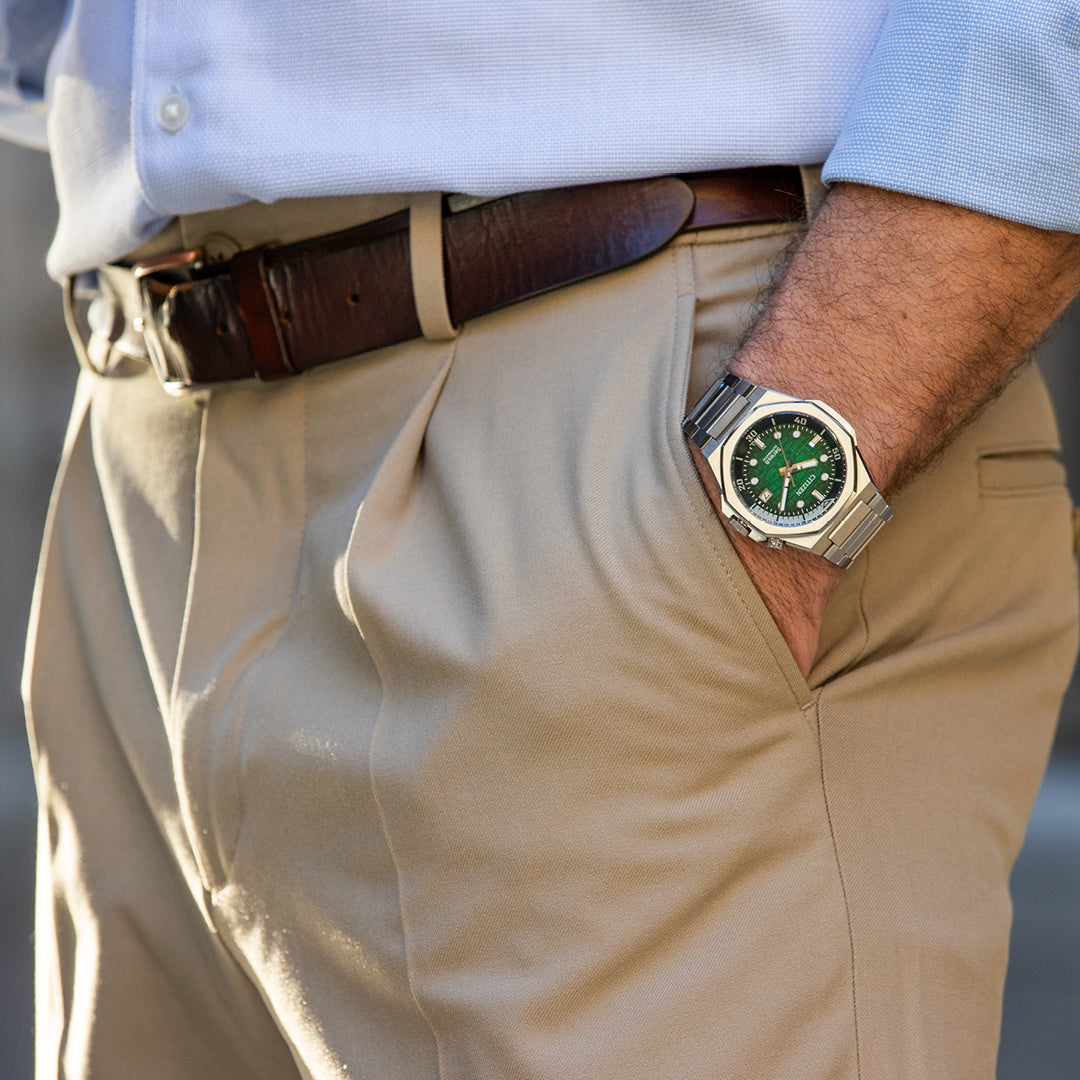 Introducing the newest addition to the Series 8 Collection: the NB6060-58L. This timepiece is defined by its sleek lines and dynamic 5-piece case construction. The design effortlessly combines hairline and mirror finishes, highlighted by a striking green textured dial. The uncluttered dial features clear, highly visible index markers and hands, embodying the minimalist aesthetic inspired by the art of subtraction. Engineered for everyday wear, the watch offers enhanced magnetic resistance against digital devices, housed in a thin case that strikes the perfect balance between a bold presence and exceptional comfort on the wrist. It features a scratch-resistant Sapphire crystal with an anti-reflective coating, a 42-hour power reserve when fully wound, and antimagnetic protection up to 16,000 A/m. With its perfect harmony of refined craftsmanship and modern technology, the NB6060-58L delivers both style and performance, making it an ideal companion for the discerning watch enthusiast.