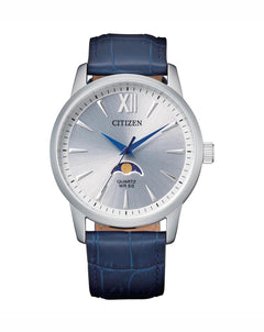 Stylishly masculine, this Quartz Moon Phase creates a dashing and suave impression. A combination of good looks, sturdiness and capability. It is perfect for wear in the office or having evening drinks with friends. Featuring a meticulous silver tone dial and cobalt blue leather strap. This stainless steel case and Moon Phase design is a timepiece for all occasions.