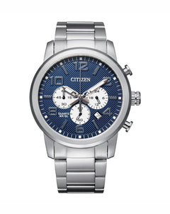 Read MoreThis Citizen mens watch from our Dress Collection features a textured deep blue dial, prominent stainless steel case and bracelet. It presents a co-ordinated but bold look. The dial displays the date and 12/14 time, while chronograph, supported by advanced quartz precision timekeeping, can measure up to 60 minutes in one second increments.