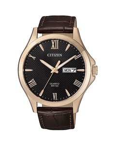 Read MoreWith styled minimalism its signature, this watch from the Gents Dress Collection is designed to be a functionally effective timepiece for the modern man on the go. Dependable in the extreme, it features 3 year battery life, WR50/5bar and accuracy to within 20 seconds per month. Black dial featuring day and date display and ruggedly constructed gold-toned stainless steel case and brown leather strap, it is a stylishly understated everyday timepiece. Caliber number 1502.