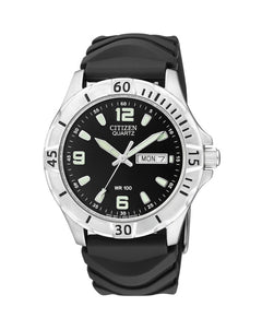 Read MoreThis Citizen men's dress watch has a sturdy appearance. The uncluttered black dial displays large luminescent numerals, details and hands, and is surrounded by a robust, durable stainless steel casing. The bezel is textured and features bold second markings. The rugged, rippled black rubber strap provides a secure fit. Featuring our advanced quartz precision, this timepiece provides the necessary functions you expect of a modern watch. The day and date can be seen at a glance, while water resistance suitable for water sports or wearing in the surf and the extended five-year battery ensure dependability. Let faithfulness and quartz precision enhance your day.