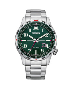 Read MoreThis aviator-style addition to Citizen's Eco-Drive collection is great for work and everyday wear. This watch features a brushed stainless-steel case and compass-inspired olive-green dial with iconic crosshair design, bold luminous markers, and white and magenta hands. Additional features include a stainless-steel bracelet, short fold-over double-push closure, and water resistance of 100 meters.