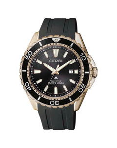 Read MoreAwarded ISO 6425 approval for diving, this Eco-Drive powered watch from the PROMASTER Collection maintains refinement while taking performance to exciting extremes. Designed with diver safety in mind, it features secure screw lock crown to keep it watertight and unidirectional bezel to remove the danger of accidental turning underwater. Built strong from stainless steel, it features rose gold plating and ebony dial for a sophisticated aesthetic that is versatile enough to coordinate with either a tailored suit or a wetsuit.
