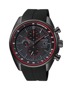 Read MoreWithout the need for batteries thanks to Eco-Drive, and possessing a rigorous tachymeter plus chronograph accurate to 1/5 of a second, this watch is designed for a fast-paced, active lifestyle. Built to be durable enough for even the most adventurous of people, it is made from stainless steel and features a polyurethane strap and mineral glass. With radiant red bezel and highlights, adds good looks to an already impressive resume.