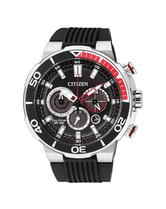 Read MoreIntricate craftsmanship, stylish design and forward thinking technology characterize this watch from the Chronograph Collection. Possessing an expansive 46mm face, WR200 and a comfortable polyurethane strap, it is an ideal diving companion that is easily accessible underwater, and designed for a versatile and active lifestyle on land. With a classic look and stainless steel construction, it simultaneously looks sharp and is durably strong. Eco-Drive harnesses light energy and uses it to power this watch and its precision chronograph, accurate from 1/5 of a second all the way up to 60 minutes.