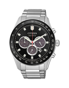 Read MoreThe pursuit of precision, the hallmark of the Chronograph Collection, lies at the core of this ruggedly stylish timepiece. In addition to accuracy ensured via the chronograph, the performance of this watch is powered by Eco-Drive, obtaining energy from any light source and eliminating the need for batteries. Featuring WR100 with a multi dial as well as date display. Constructed with stainless steel with a black dial this watch is as sharp on looks as it is on performance. Caliber number B620.