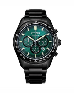 Read MoreTaking it up a notch with this sophisticated colour combination. This chronograph features a perpetual calandar that has dual time, day/date, month and alarm. With a mesmerising emerald green dial and black Ion plating bracelet featuring sapphire glass, you will always be on trend. Also featuring Eco drive technology, powered by light, any light. Never needs a battery.