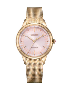 Read MoreInspired by the Gerbera flower, this new Citizen L model encapsulates the vibrant beauty of the Gerbera in full bloom with petal-shaped indices against a beige, sunray radial dial that represents the freshness and delicateness of the flower. Encased in an elegant 33mm rose gold-tone stainless-steel case, matching rose-mesh band with sliding clasp, rose gold-tone hands, Eco-Drive technology, sapphire glass and water resistance of up to 50 meters. This watch embodies the irresistible beauty of nature and Citizen's relentless initiative towards a sustainable future.