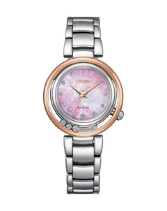 Read MoreClassic lines and hints of romance make this newest piece to our women’s collection, the Citizen L Arcly, a captivating addition of sustainable luxury. With a design inspired by the original Citizen "Sunrise," the distinctive stainless-steel timepiece is a charming accent on the wrist that's perfect for glamorous wear. Sleek lines define the watch's 29.8mm silhouette, with a subtle 4 o'clock crown and 7 o'clock diamond accent adding to its entrancingly delicate look. On its fairy pink mother-of-pearl dial, applied diamond markers and sharp hands indicate the time in style atop a subtle flower motif, keeping the attention on the pure aestheticism of the timepiece. Sustainably powered by any light with our proprietary Eco-Drive technology that never needs a battery, this elegant ladies’ watch is the perfect addition to elevate any outfit. Water resistant to 50 meters.