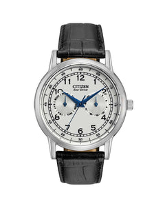 Read MoreBuilt from tough stainless steel and featuring a white dial with black markings, silver toned bezel and sleek black oxhide leather strap for comfort, this watch represents sophisticated performance with classic styling. Batteries are never required thanks to Eco-Drive technology, which draws energy from any light source, further reducing weight and adding to the allure of this gorgeous watch.