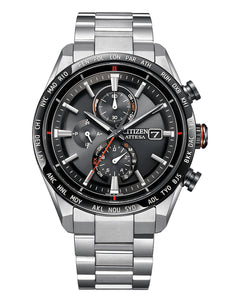 Initially introduced in 1987, the Attesa watch series is dedicated to delivering a heightened sense of luxury, unmatched precision, and unwavering performance within Citizen's line of chronographs. This timepiece boasts a resilient, scratch-resistant Super Titanium™ case and a matching bracelet. It features a world-time-equipped bezel and showcases silver, black and orange accents that contrast beautifully against the elegant black three-register chronograph dial, which also includes a date window at 3 o'clock. In addition to its striking design, the Attesa offers a host of practical features, such as world time functionality covering 26 time zones, a power reserve display, a perpetual calendar with day and date indicators, 12/24-hour timekeeping, a sapphire crystal for added durability, and water resistance up to 100 meters. What sets this watch apart is its implementation of Eco-Drive technology and Atomic Timekeeping capabilities. This means that the watch will automatically synchronize with the correct time and date when travelling abroad, thanks to its ability to receive local time signals from transmitters and atomic clocks in three distinct regions: Europe, the USA, and Japan.