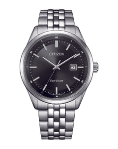 Read MoreCombining functional simplicity with a touch of elegance, this timepiece makes a distinctive style statement. It features a silver-tone stainless steel case and a textured black three-hand dial, encased in sapphire crystal. The silver-tone stainless steel bracelet complements the design, while water resistance up to 100 meters ensures durability. Sustainably powered by Eco-Drive technology, this watch never needs a battery, just a light source.