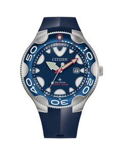 Read MoreCommand the sea in style with the new Promaster Marine. This iconic Citizen men’s dive watch is the latest addition to the Promaster Marine collection with a strikingly original design inspired by the majestic Orca whale. The sporty and functional dive timepiece features a silver-tone stainless steel case accented by a blue three-hand dial and date with elliptical white hour indices and bezel indentations that evoke the shapes of the orca, plus pops of color at the 12 o’clock marker and minute hand. This ISO-compliant dive watch also features anti-magnetic and anti-shock resistance, a one-way rotating elapsed-time bezel, and luminous hands and markers filled with a superior lume for legibility. The blue polyurethane strap mimics the form of the orca’s fin and fastens with a buckle, and the watch is water resistant up to 200 meters with a screw-down crown, making it a perfect companion on your next dive. Sustainably powered by any light with Eco-Drive technology that never needs a battery, this is the ultimate dive watch to own and comes in a unique scuba tank-inspired box for the serious diver and collector