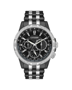 Read MoreBalancing sophisticated performance and bold stying, this watch from the World Time Collection creates a lasting impression. Crafted from robust stainless steel with black ion plating and WR100/10bar, it is built to withstand the pressures of the world, and with Eco-Drive technology sourcing power from light with 6 months supply kept in storage, there is never a need for batteries. Showcasing inspired design elements, the sleek combination of matte black and brushed metal tones compliments the striking black face with day/date display, 12/24 hour time and low charge indicator. Adorning this timepiece like a crown, 32 stunning diamonds are set into the bezel, giving this watch a look that is a finely measured blend of masculinity and luxury.
