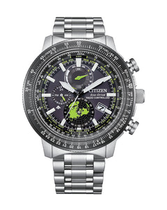 Introducing the new Promaster - a timepiece that pushes the boundaries of style and functionality. Crafted with a bold 46mm stainless steel case in silver-tone, it stands as a testament to both rugged durability and sleek design. This professional-grade pilot's watch is equipped with a set of bold chronograph pushers, a 5-link stainless steel bracelet, and a slide rule bezel, all designed to meet the demands of the most discerning wearer. Protected by a scratch-resistant sapphire crystal, the watch's data-driven display offers rapid legibility with its white and green-tone accents against a dark background. At the 6 o'clock position, a northern hemisphere disc rotates counter-clockwise, presenting world time in a map-inspired design, adding both utility and visual appeal. Among its array of functions are running hours and minutes, date indication, power reserve indication, world time, and the versatile slide rule bezel function. What sets this sports watch apart is its utilization of Citizen's Eco-Drive technology, harnessing sustainable power from any light source and eliminating the need for battery changes. With water resistance up to 200 meters, the Promaster is ready to accompany adventurers on any journey, offering both style and reliability in equal measure. Whether soaring through the skies or diving into the depths, this timepiece promises to be a steadfast companion, ready to touch the edge of the sky and beyond.