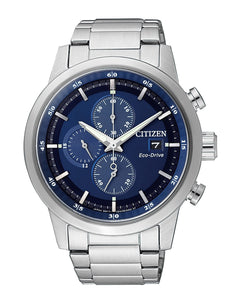 Read MoreLiving life in the fast lane? Compliment your style with this sporty addition to the chronograph collection. Featuring a brushed stainless-steel case, blue dial with white racing elements, silver-tone markers and white hands. Additional features include Eco-Drive technology, 6-hand and calendar movement, stainless-steel bracelet, short fold-over double-push closure, and water resistance of 50 meters.