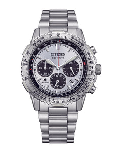Read MoreFly high and stay stylish on land with the Promaster Sky men’s chronograph watch from Citizen. Inspired by pilots, this timepiece features a sleek stainless steel case, complemented by a silver-plated rotating bezel with a professional calculator function and tachymeter. The vibrant white dial is accented with luminous hands and markers, all protected by a durable sapphire crystal. Equipped with cutting-edge technology, this watch offers atomic time clock synchronization for exceptional accuracy, a 1-second chronograph that measures up to 60 minutes. The stainless steel bracelet ensures a comfortable fit, and like other models in the Promaster series, it boasts water resistance up to 200 meters. Powered by Eco-Drive technology, this sustainable watch harnesses light—never needing a battery—making it ideal for both aviation pursuits and everyday wear.
