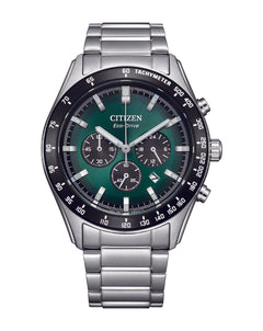 Read MoreAn extension of the Chronograph range, this multigenerational chronograph is your perfect accessible pilot timepiece. Featuring an array of aviation level functionality such as Eco-Drive technology ensuring your watch never loses power, a thin bezel with a wide dial for better visibility and luminous markings. Armed with base 30 pulsations for high accuracy heart rate count. This method is one which is used medically to measure heart rates both quickly and accurately. Start counting the heart rate for 30 beats from the 12 hour marker. When you reach 30, where the second hand points is the heart rate. Secondary functions include date, 12/24 hour time, water resistance to WR100/10 Bar, ideal for swimming and snorkelling. This model has definite classic appeal with a dress edge found in the stainless steel bracelet style band, emerald green dial and stainless steel case and bezel, topped with a Sapphire crystal glass.