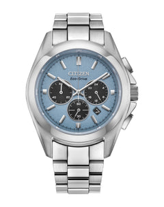 Read MoreThis new Sport Luxury chronograph blends modern design with everyday performance. Crafted in silver-tone stainless steel, the 40.5mm case frames a sunray light blue dial, accented by black sub-dials for a sleek contrast. A sapphire crystal adds durability and clarity. Functionality includes a 1/5 second chronograph measuring up to 60 minutes, 12/24-hour time, and a date display—perfect for life on the go. The matching stainless steel bracelet features a fold-over clasp with push buttons for a secure and polished finish. Powered by light with Citizen’s Eco-Drive technology, it never needs a battery. Water resistant up to 100 metres.