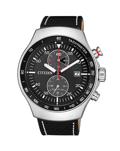 Read MoreIn addition to accuracy ensured via the chronograph, the performance of this watch is powered by Eco-Drive, obtaining energy from any light source and eliminating the need for batteries. Featuring WR100 with a multi dial as well as date display. Constructed with stainless steel with a black dial as well as the black leather strap, this watch is as sharp on looks as it is on performance. Caliber number B642.