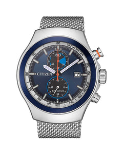 Read MoreThe pursuit of precision, the hallmark of the Chronograph Collection, lies at the core of this ruggedly stylish timepiece. In addition to accuracy ensured via the chronograph, the performance of this watch is powered by Eco-Drive, obtaining energy from any light source and eliminating the need for batteries. Featuring WR100 with a multi dial as well as date display. Constructed with stainless steel mesh bracelet and case with a deep blue dial this watch is as sharp on looks as it is on performance. Caliber number B642.
