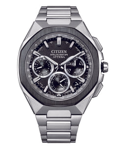 Read MoreRenowned for its innovative design and advanced technology, Attesa continues to lead the evolution of reliable luxury timepieces. The F950 series, powered by cutting-edge Eco-Drive Satellite Wave GPS technology, sets itself apart with the world’s fastest time-only signal reception—achieved in just three seconds. This latest model is housed in a newly designed, scratch-resistant silver Duratect Super Titanium™ case, paired with a black octagonal ceramic bezel—a first for the Attesa line. The case features a distinctive rough hairline finish, a challenging detail to execute with titanium, which enhances its bold and robust aesthetic. Combining contrasting materials, the design conveys a sense of solidity, further expressed through the rough-textured dial reminiscent of a titanium gemstone and a metallic-finished inner ring that reinforces the watch’s strong exterior. Key features include a sapphire crystal bezel, 39-city world time function, dual time display, perpetual calendar, light level indicator, charge suspension temperature detection, overcharge prevention, over-discharge detection, and water resistance up to 100 meters