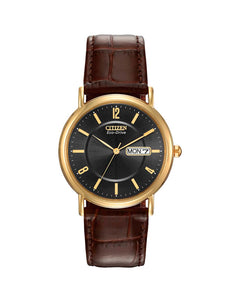 Read MoreDetailed craftsmanship, stylish design and future-proofed technology. Constructed from stainless steel gold plating with a black dial, day date indicator with brown leather strap. A watch like this says you mean business. Eco-Drive harnesses power from light sources to power this watch.