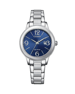 Read MoreA popular design, this simple and elegant women’s business/dress style will take you from day to evening. Characterised by a simple and clean design, the band is brushed stainless steel bracelet surrounding a silver stainless steel case and a stunning deep blue brass dial finish providing an elegant touch. Topped with mineral crystal glass. Enhanced with Eco-Drive technology which allows your battery to self-charge from any light source, you can also use this model for swimming and snorkelling as it is water resistant to WR100/10 bar. A reliable timepiece with a classic design, a watch for every occasion. Additional features include 3 hands and date.