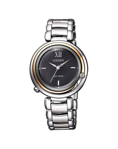 Read MoreThe luxury of the Citizen ladies L diamond collection watch is subtly minimalist yet durable design that is further enhanced by the sleek black dial. This ladies watch combines a design found in the beauty of nature with the innovative design and functionality of Eco-Drive technology. Featuring two-tones stainless steel case and sapphire crystal glass. Caliber number E031.