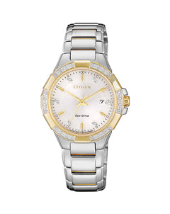 Read MoreShine bright with the enhanced CITIZEN Riva collection, powered by any light with Eco-Drive. Adorned with diamonds on the bezel and dial, you will be sure to stand out wearing the Riva. Featured in gold-tone stainless steel with a brilliant silver dial and date. Featuring our Eco-Drive technology – powered by light, any light. Never needs a battery. Caliber number E013.