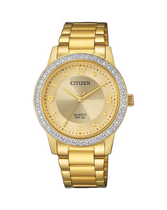 Read MoreExtravagant design, lavish looks and classic functionality come together in a seamless fusion of elegance in this statement piece. With an aesthetic that demands attention, a lustrous, shimmering bezel encrusted with crystal elements encompasses the stunning gold accented face, while beautiful matte gold tones also emanate from the band and case for a look that is all about luxury. Built from hard-wearing stainless steel with gold plating, it uses a Quartz mechanism to ensure precision is within 20 seconds per month and also carries a 3 year battery life, providing the performance needed for those who desire an epicurean lifestyle.
