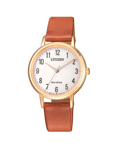 Read MoreDesigned for versatility and comfort, this watch highlights the elegance of simplicity without compromising on precision in performance. Featuring Arctic white face surrounded by the lustrous golden hues of the lightweight bezel and case and supple chestnut oxhide leather band, this piece is where comfort and beauty come together. Built for durability from strong stainless steel and mineral glass, it also draws power from any light source in its environment with Eco-Drive technology, so you never have to take time out to replace batteries.