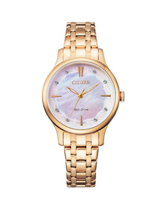 Read MoreA contemporary timepiece with a chic design that will fit your style from day to night. Featured in a gold stainless steel bracelet and pink mother of pearl dial. This striking accessory adds feminity to any occasion. Crafted with crystals throughout the dial, turn heads wherever you go. Powered by Eco-Drive technology, never needing a battery.