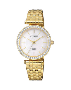 Read MoreFeaturing a Japanese Quartz movement. Delivering a sophisticated look and the durability required for everyday wear, it is crafted from mineral glass with gold-tone stainless steel case and bracelet, stylishly paired with a gorgeous mother of pearl dial and crystal elements for a look that suits any wardrobe. Equipped with 3 year battery life, WR and handy push button buckle, it is a timepiece you can depend on. Caliber number 9633.