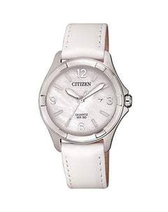 Read MoreA unique blend of ageless grace and casual chic, this watch from the Ladies Dress Collection embodies the beauty of simplicity. Exuding stylish femininity, the elegant mother of pearl face is accentuated by the tasteful and comfortable Arctic white oxhide leather band, creating a clean and sharp aesthetic. Plus, when it comes to performance, this watch has the reliability of a Quartz mechanism, 3 year battery life and accuracy to within 20 seconds throughout the course of a month, ensuring it always keeps up with the pace you set.