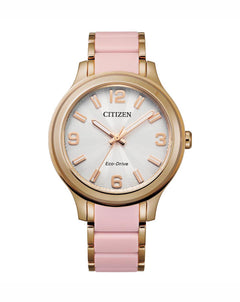 Share your fashionable point of view starting with this simple and contemporary model. A stainless steel case with stainless steel and pink silicone band. Featuring a white dial that makes this model stand out from the crowd. Featuring our Eco-drive technology, never needs a battery, only a light source.