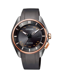 Read MoreIn the eternal quest to achieve improved performance, it is important to always be who you want to be. Making a statement in individuality with its eye-catching style, this watch showcases championship pedigree via cutting-edge technology. Equipped with Bluetooth, the watch will pair with your smart phone through the Citizen app to keep you informed of any incoming calls, messages or social media notifications, while maintaining a classic analogue presentation. Employing an uncomplicated single button interface, the watch alerts you if it is about to lose connection with your phone and also even has an incredibly handy find my phone feature. Possessing time synchronisation capability, it will automatically update in 315 cities around the globe so you don’t have to manually wind the watch when you land. Powered by a Calibre W410 Eco-Drive movement, it converts light into energy instead of using batteries, maintaining operation for 4 years with its power saving function without ever requiring annoying and cumbersome cables or charging ports. Crafted from lightweight Super Titanium with scratch-resistant, unreflective sapphire glass and a polyurethane strap, it is built tough, and with its bold ebony hued dial and elegant pink gold plated bezel, crown and button, it is a stunning expression of beauty, durability and functionality.