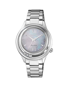 Read MoreBeauty meets performance in the exciting fusion of craftsmanship and technology this watch possesses. Bringing elegance to the aesthetic, four shining diamonds float elegantly on the bezel catching the eye, while the stunning mother of pearl dial adds luxurious refinement. Constructed from stainless steel with white plating and sapphire glass, and with Eco-Drive Technology sourcing power from light, it is simultaneously beautiful, durable and intelligent.