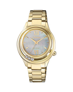 Read MoreWith four glinting diamonds and Eco-Drive Technology obtaining power from light, this watch takes precision and makes it stylish. With the gold tones of the band and bezel gently setting the backdrop, the diamonds and elegant mother of pearl dial shimmer brilliantly. Accurate to within 15 seconds throughout an entire month and featuring WR50 and push-button buckle, it is convenient and comfortable to fit into your lifestyle. Crafted from stainless steel with white and gold plating plus scratch resistant sapphire glass, its signature is resilient beauty.
